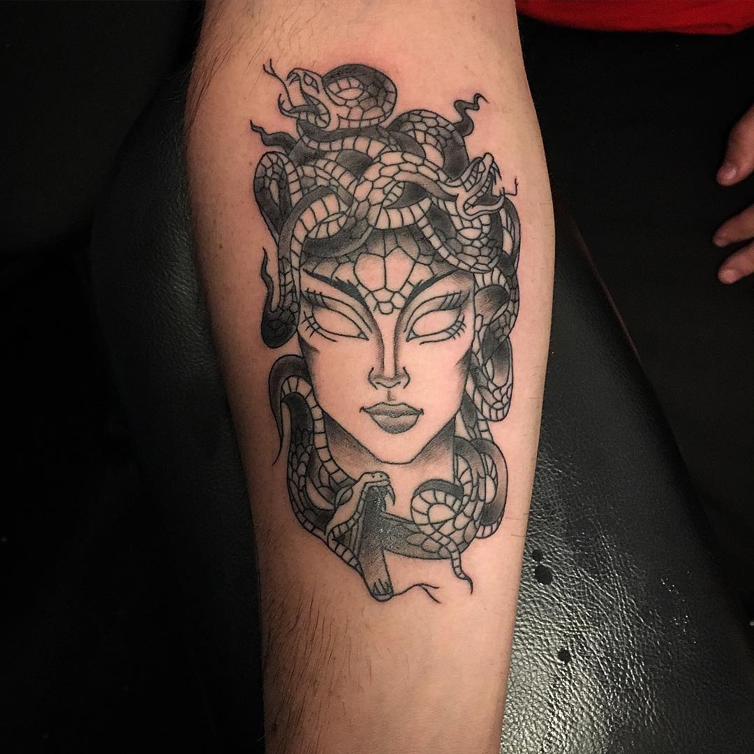 美杜莎的纹身元素大家肯定都不陌生了,在古希腊的神话故事中蛇发女妖是一个家喻户晓的传说,蛇发女妖美杜莎本来是一个非常美丽的女子,因为海神波塞冬抵制不住诱惑化身骏马与她在雅典娜神殿中偷情而触怒雅典娜,雅典娜将她变成了蛇身人头的妖怪,没有头发只有盘绕的小蛇,即使如此美杜莎的面庞海神依然美丽动人,只要有人对视她的眼睛,都会被他的美丽诱惑从而变成一尊石像。所以在西方文化中,美杜莎是只可远观不可亵玩的神灵,她的美貌与恶毒是并存的,人们也相信将他的头像刻在门上或者戴在身上可以有驱邪避祸的效果,所以这个题材在纹身中也受到很多人的喜爱和追捧。